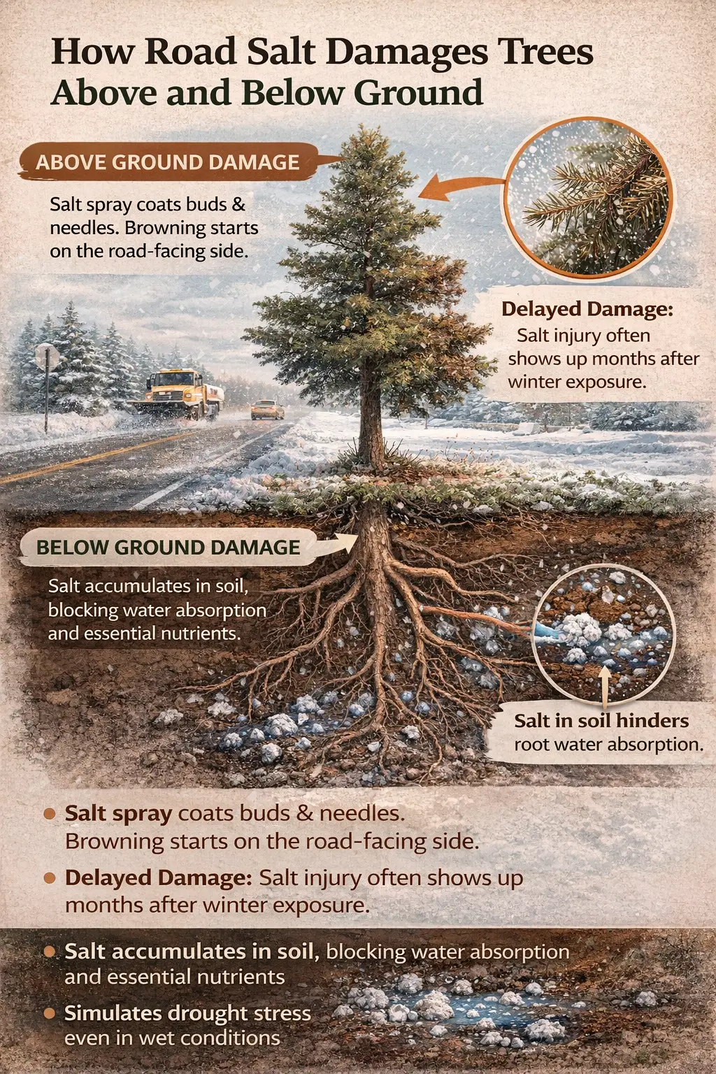 Road salt affects trees in two primary ways. It alters soil chemistry around the roots and it directly damages above-ground tissue through spray and splash.